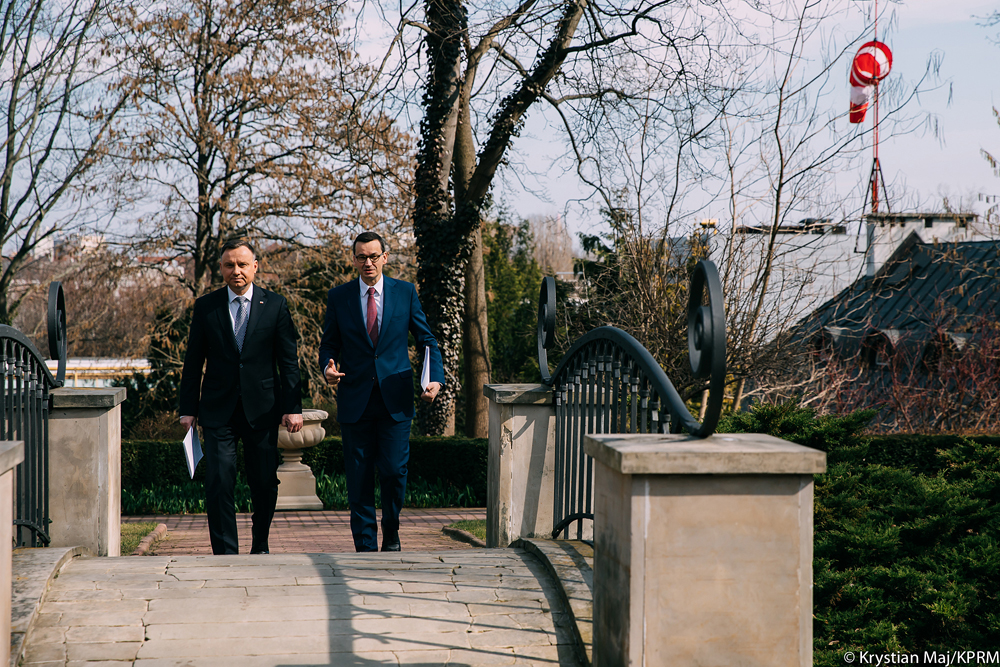Zdjęcie główne: Prezydent Andrzej Duda oraz premier Mateusz Morawiecki po posiedzeniu Rady Gabinetowej w formie wideokonferencji 18 marca 2020 r., Fot. Flickr/KPRM/Krystian Maj, licencja Creative Commons